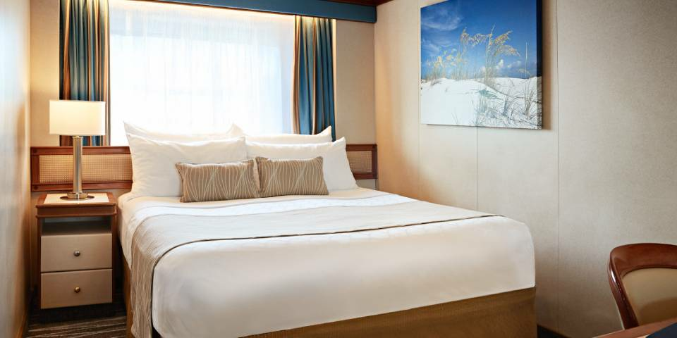 All standard staterooms are furnished with a queen bed (which can usually be split into twins), small round table, desk/vanity (with three drawers) and chair, two bedside tables (with two drawers and a shallow shelf) each topped by a lamp and ample closets with both hanging sections and shelves.