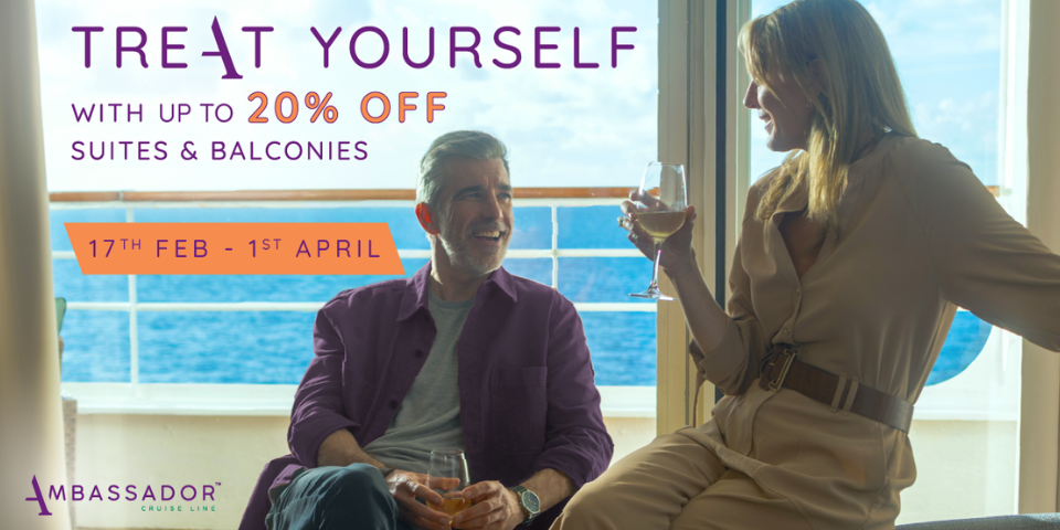 Step onboard and Treat Yourself to a memorable escape with up to 20% off Balcony and Suite cabins. Enjoy a private balcony with peaceful sea views and a suite that’s just the right size for relaxing. It’s the perfect way to unwind and leave the everyday behind, because moments matter.