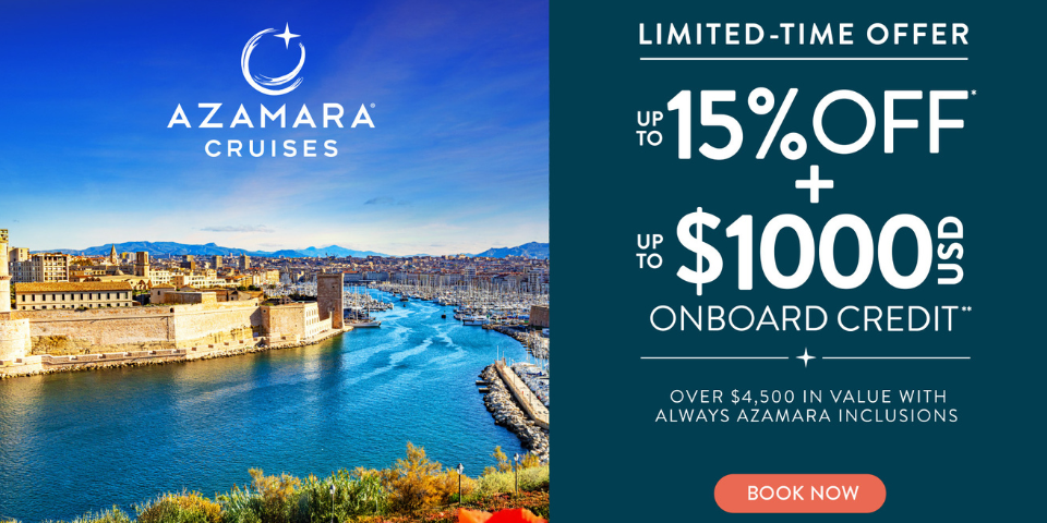 For a limited time, you can take advantage of Azamara Cruises' fabulous offer and receive up to 15% off your cruise fare and up to $ 1,000 in Onboard Credit per stateroom.