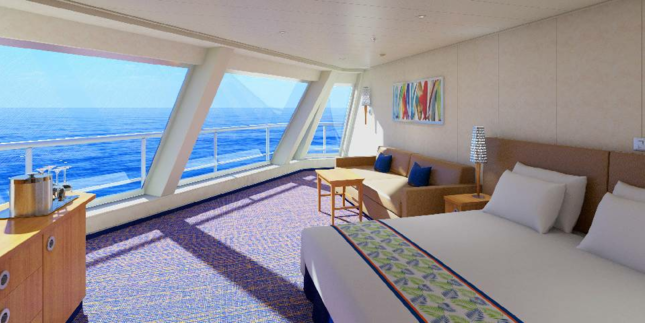 Ocean Suite: There are 41 Ocean Suites, which measure 275 square feet plus a 65-square-foot balcony. These are essentially larger versions of balcony cabins with more interior space and extra storage.