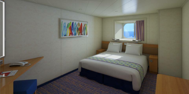 Interior: At 185 square feet, inside cabins feel reasonably spacious, probably because they do not have a sitting area. Storage space is limited, especially if you're looking for drawers. The lower categories only have bunk beds or a twin plus sofa bed; look out for a few cabins categorized as inside but that actually have windows that look out on a public walkway area.